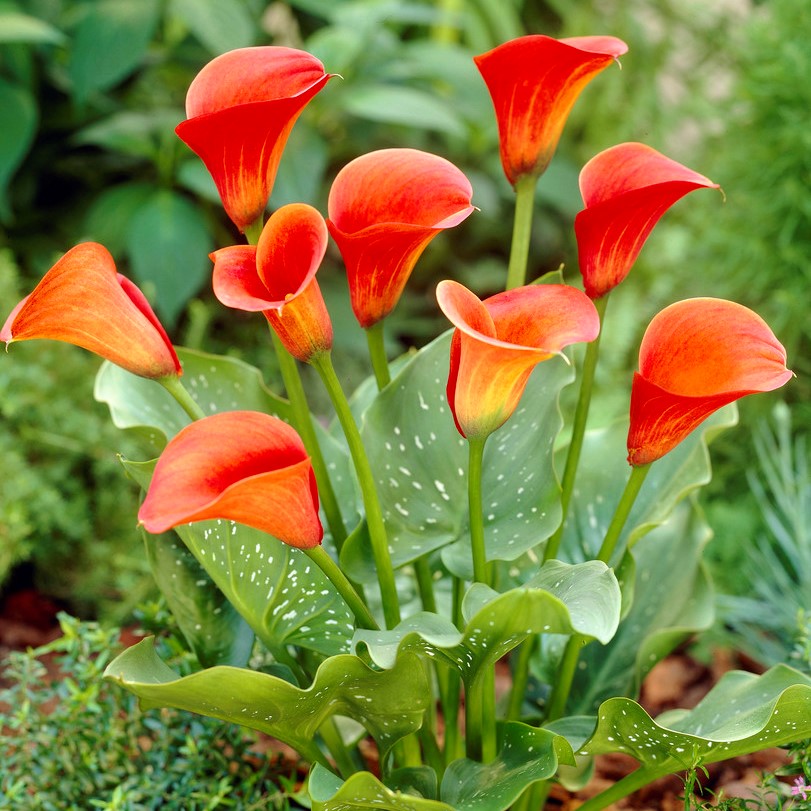 Vackra blommor i en gulröd ton. Bladverket är grönt med vita prickar. Fin som snittblomma.