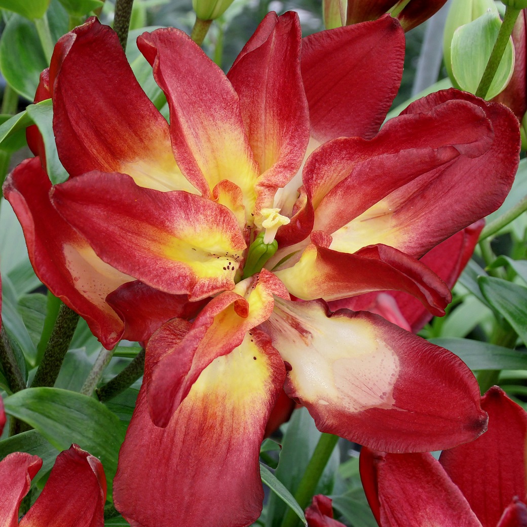 rödrosa m vit mitt, halvfylld, juli-aug, 60cm, sol, halvsk, pollenfri.B