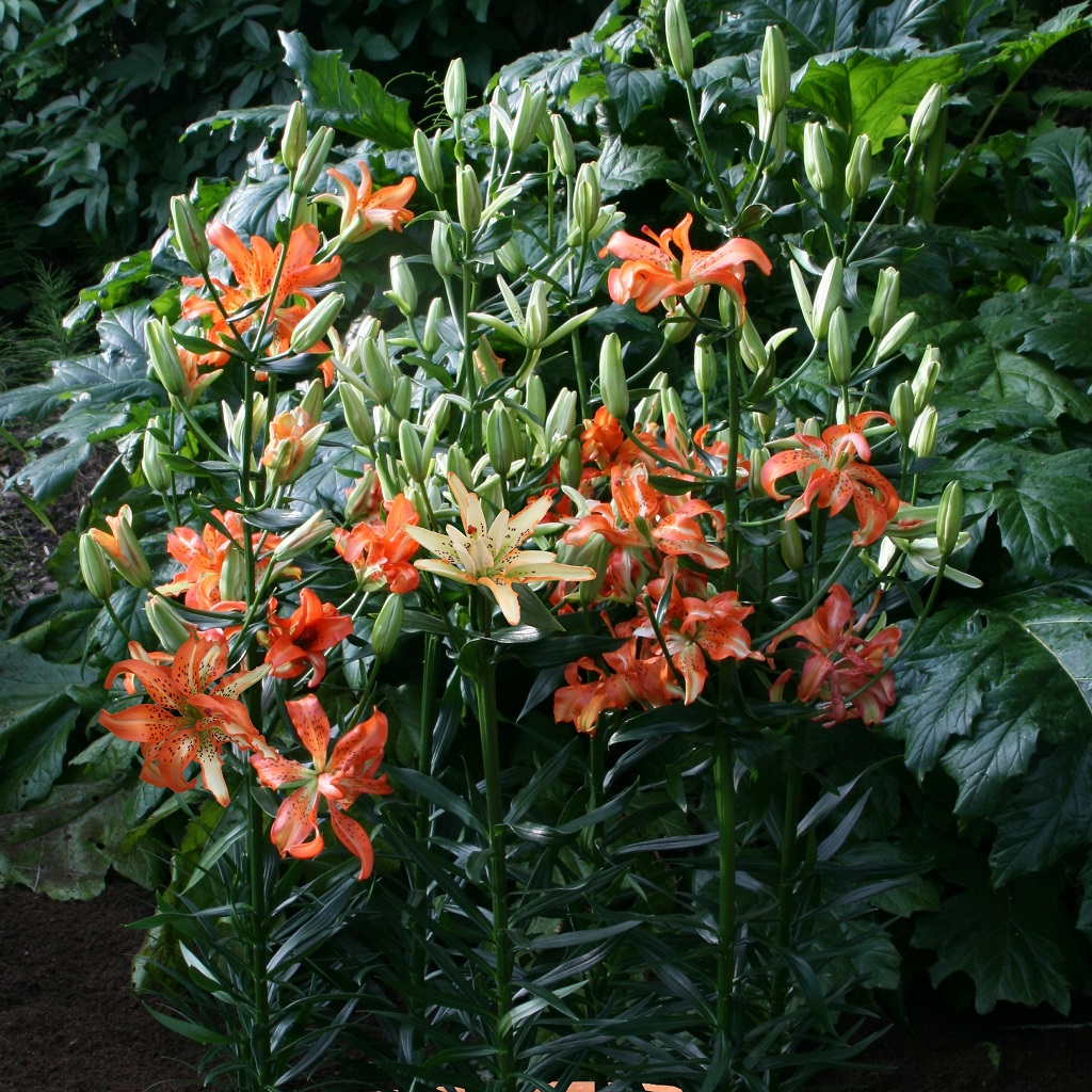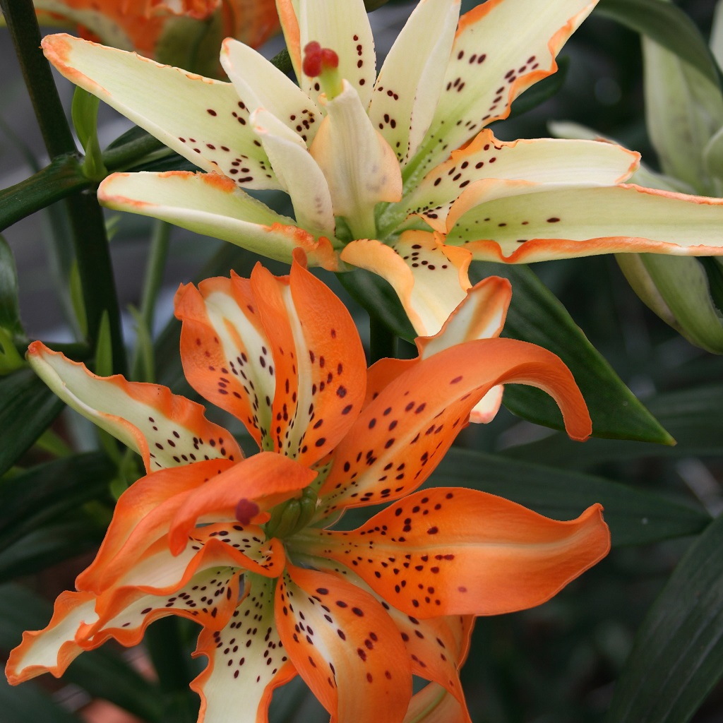 En spännande lilja med blommor i orange och vit i ett oregelbundet mönster! Pollenfri sort som är fri från doft.
