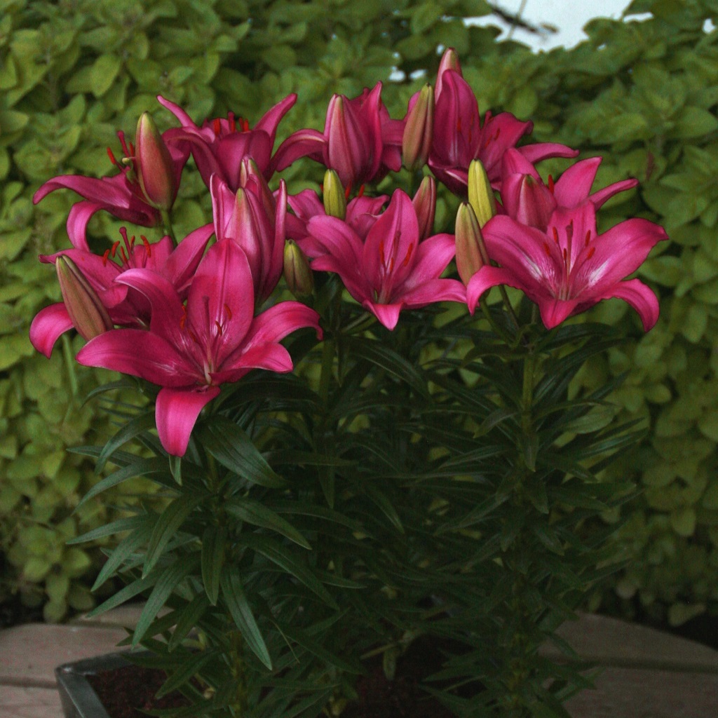 En låg sort med vackra mörkrosa blommor.